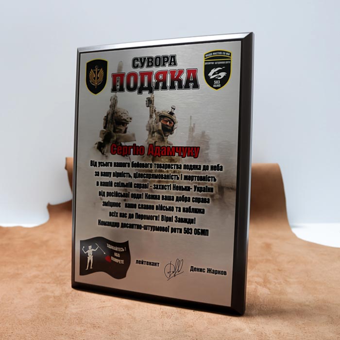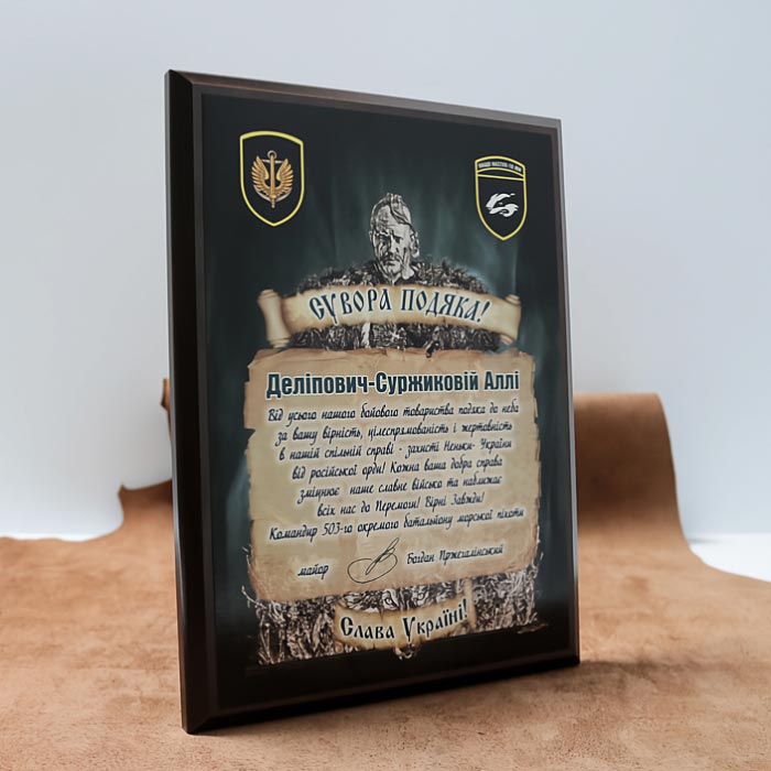 Диплом (плакетка) деревянный (МДФ) наградной с металлом 20*15 см АРТПРИЗ В качестве почетной награды за достижение особых результатов на мероприятии идеально подойдет металлический диплом на плакетке. Внешне такой наградный элемент смотрится очень эффектно, особенно с золоченым или серебристым оформлением. Дополнительно кроме текстового содержания на поверхность может быть полноцветное изображение. Металлический диплом может стать большей версией уже имеющегося сертификата или лицензии в бумажном варианте. Аналогично наградной грамоте такой вариант документа будет выглядеть куда элегантнее, чем лист бумаги. К тому же металлический диплом требует гораздо меньше ухода, что тоже его важное преимущество. Оформить заказ на металлический наградный диплом 20х15 см можно по форме ниже. Среди доступных вариантов есть как готовые шаблоны, так и полностью по оригинальному дизайну и оформлению. Для подробного ознакомления рекомендуем обратить внимание на товары в каталоге ArtPriz. Приз выставлен как образец, при изготовлении мы сделаем полностью новый дизайн под ваше мероприятие. Цена зависит от количества, сроков и дизайна макета. По всем вопросам купить или узнать цену обращайтесь к менеджерам. Звоните сейчас +380505510086 | (097)21-47-005