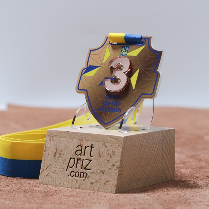 Металлическая медаль в форме щита-прекрасная награда в честь достижений. Эта медаль из высококачественного металла изображает символику третьего места в национальном стиле. Размер медали — 75×75 мм, что позволяет легко разглядеть все детали на ее поверхности.