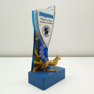 Основа награды выполнена из массивного дерева, окрашенного в глубокий синий цвет, символизирующий стабильность, надежность и глубину. На этом основании размещена изящная объемная фигурка собаки (возможно, овчарки или другой служебной породы), выполненная по технологии 3D-печати и окрашенная под благородное золото. Эта фигурка установлена на небольшой подставке, что придает ей визуальный вес и подчеркивает детализацию.