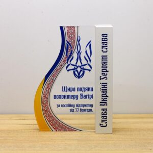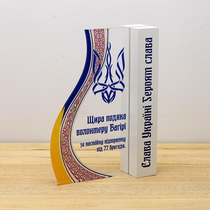 Награда выполнена из акрила с деревом плюс нанесение УФ печати.