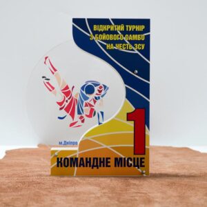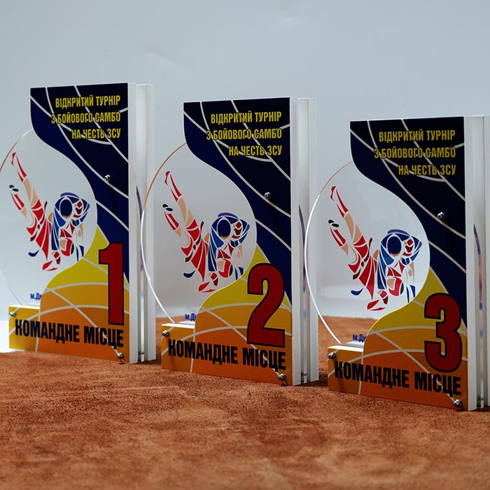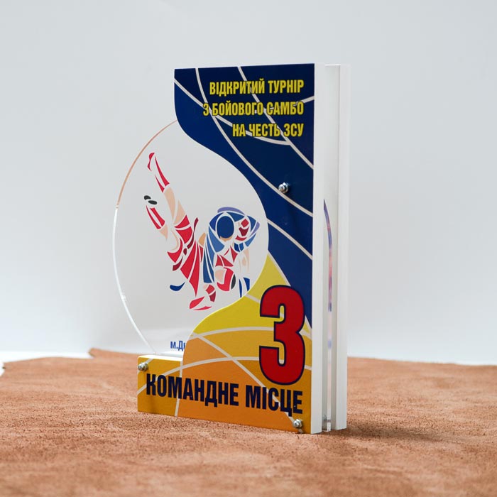 Награда выполнена из акрила с деревом плюс нанесение УФ печати.