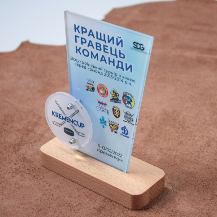 Награда выполнена из акрила с деревом плюс нанесение УФ печати.
