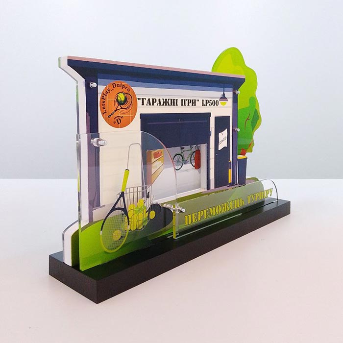 Приз изготовлен из высококачественного акрила различной толщины (4 мм, 3 мм) с УФ-печатью, что обеспечивает четкость изображения и долговечность цветов. Задняя часть и некоторые элементы выполнены из фанеры 12 мм, также с УФ-печатью, что добавляет прочности и естественности.